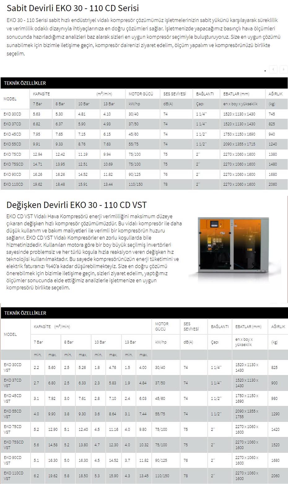 2019 yılında yenilenen CD Serisi ile, kullanımı kolay ve verimli bir hava kompresörüne ulaşırsınız. EKO Serisi dünya standartlarında vidalı kompresörden beklenen tüm gereksinimleri ve çok daha fazlasını karşılayabilir. 40 - 150 hp motor gücü yelpazesinde hava kompresörleri ile 13 bar’a kadar her basınç varyantındaki endüstri ihtiyacına, en yüksek derecede karşılık veren debiyi alabilirsiniz. Bunu yaparken kompresörler en düşük enerji harcamasıyla yatırım maliyetlerinizi en hızlı şekilde geri öder.