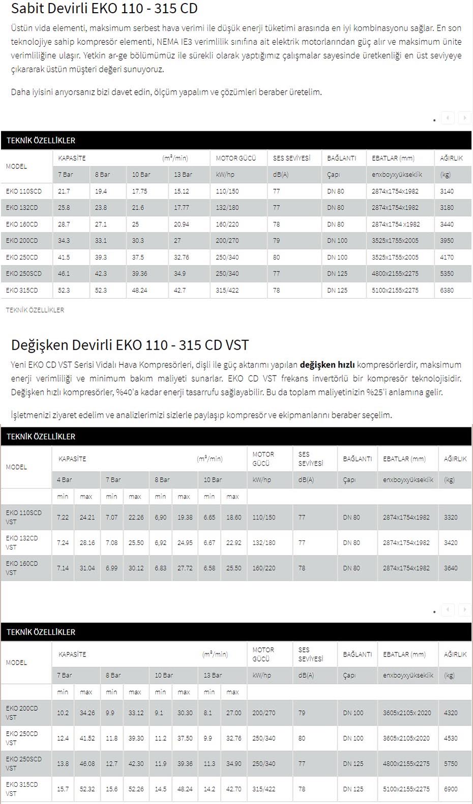 EKO CD VST 110 - 315 kW Premium Endüstriyel Kompresörler, gerçek bir endüstri canavarıdır. Ekomak Kompresör piyasadaki yerini sektörün en güvenilir, doğrudan inverter sürücülü ve sabit devirli hava kompresörü ile sağlamlaştırmıştır. Güvenilir ve yüksek verimli kurum içi dizaynı vida blokları ve dünyaca tanınmış bileşenler ile herhangi bir uygulama için en doğru çözüm olması sağlanmıştır.